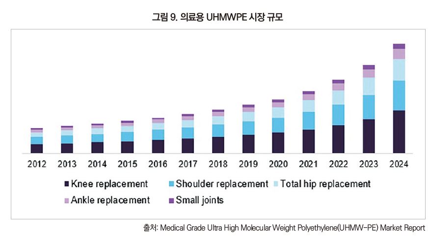 UHMWPE는 내부식성, 내마모성 및 인장 강도가 우수하고, 밀도가 낮아 가벼우며 마찰계수가 낮다. 이러한 특성으로 인해 의료용 UHMWPE이 광범위하게 사용되고 있으며 무릎, 어깨, 발목 및 작은 관절을 대체할 수 있는 인공관절 등으로 광범위하게 사용되며[그림 8], 대체 수술 분야에서도 전반적인 성장이 이뤄질 것으로 예상된다.