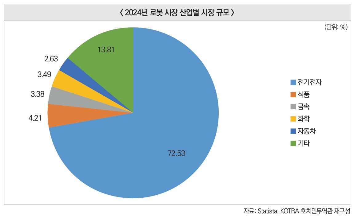 2024년 산업별 로봇 시장 비중을 보면 이러한 구조적 특징이 더욱 뚜렷하다. 전기·전자 산업이 전체의 약 72.5%로 압도적 비중을 차지한 가운데, 그 외에 식품(약 4.2%), 금속(약 3.4%), 화학(약 3.5%), 자동차(약 2.6%), 기타 산업(약 13.8%)으로 구성된 양상이다. 전반적으로 산업별 로봇 수요는 전기·전자 중심의 대규모 자동화 투자와 비(非)전자 제조업의 점진적 자동화 확대가 병행되는 구조로 분석된다.