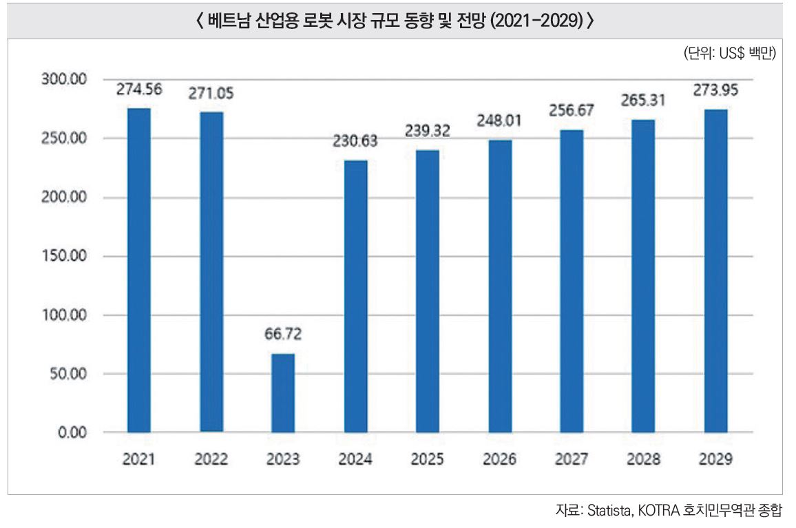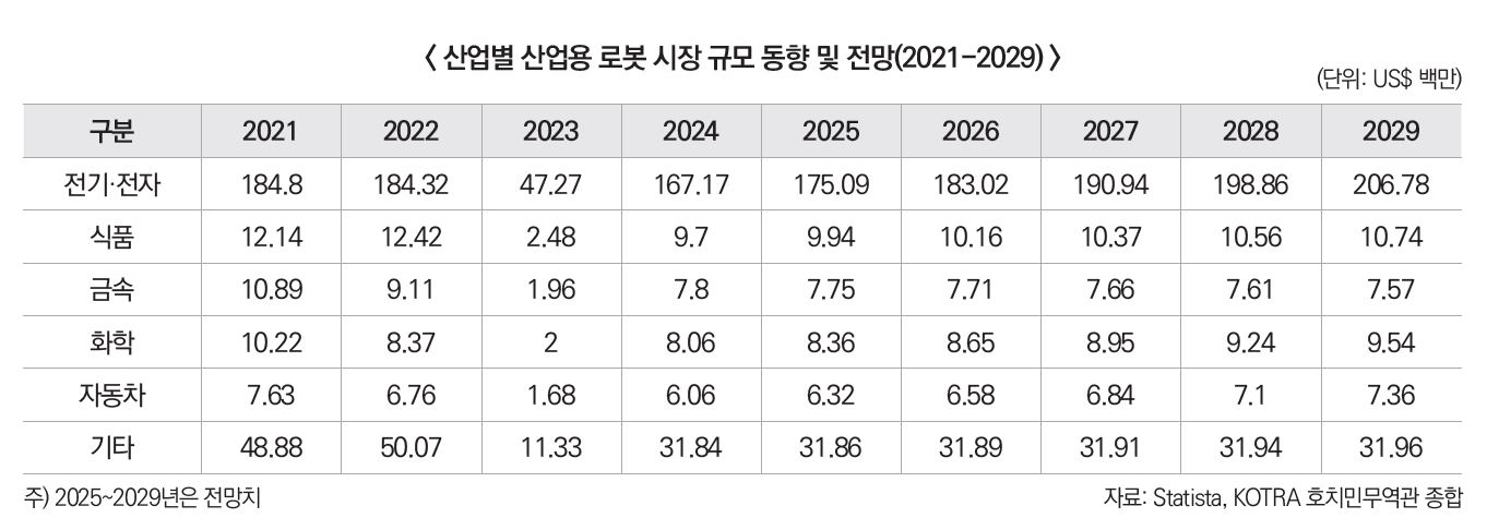 2024년 기준 전기·전자 산업의 로봇 시장 규모는 약 1억 6,717만 달러로 삼성전자 등 글로벌 전자 기업의 현지 생산 확대와 자동화 수준 고도화 흐름을 반영하는 것으로 해석된다. 반면 식품, 금속, 화학 등 기타 전통 제조 부문의 로봇 시장 규모는 상대적으로 작지만, 모두 2023년의 일시적 조정 이후 뚜렷한 정상화 흐름을 회복하며 자동화 수요가 꾸준히 유지되고 있다.