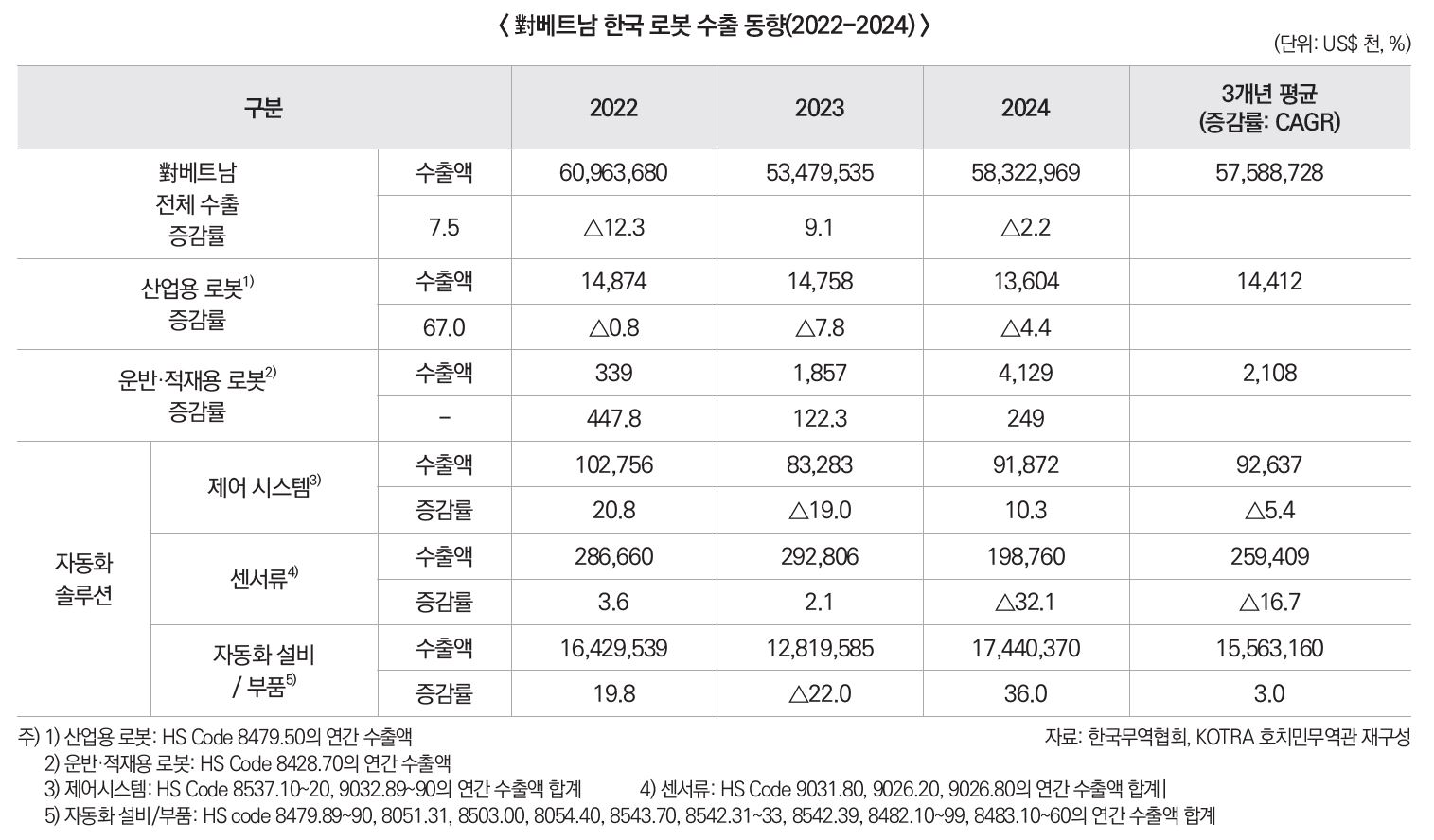 최근 3년간 한국의 對베트남 로봇, 자동화 관련 품목 수출은 품목별로 서로 다른 흐름을 보인다. 산업용 로봇은 비교적 큰 변동 없이 안정적인 수준을 유지하는 반면, 운반·적재용 로봇은 수요가 빠르게 늘어나 물류 분야 중심의 설비투자가 확대되는 흐름으로도 해석될 수 있다. 한편, 제어시스템, 센서류 등 자동화 솔루션 품목은 연도별로 증감 폭이 엇갈려 베트남 제조업체들의 설비투자 시기나 기업별 수요가 다르게 반영된 결과로 보인다.