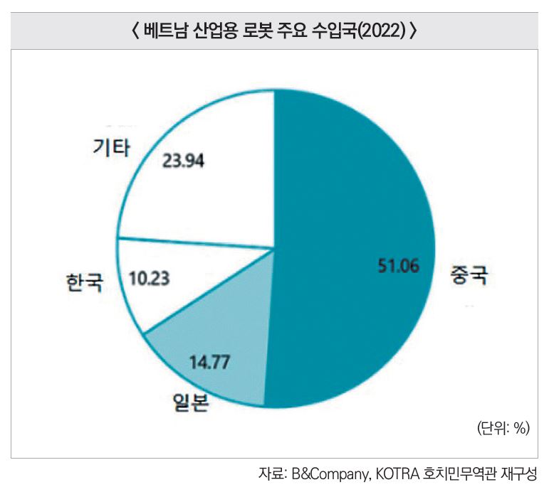 베트남의 산업용 로봇 수입 구조는 특정 국가 의존도가 높은 특징을 보인다. 베트남 컨설팅기업 B&Company에 따르면, 2022년 기준 중국이 전체 수입의 약 51.1%로 절반 이상을 차지하며 압도적인 1위로 나타났다. 이는 가격 경쟁력, 공급량, 부품 접근성 등에서 중국 제품의 우위가 반영된 결과로 해석된다. 일본은 약 14.8%로 2위를 차지하며 정밀 자동화 장비와 산업용 로봇 분야에서 수요를 나타내고 있다. 한국은 약 10.2%를 기록해 베트남 자동화 수요 증가에 따라 안정적인 공급국 역할을 하고 있다.