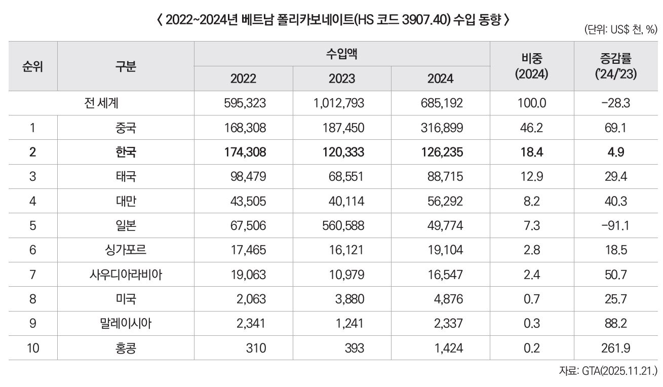 수입 구조는 중국 중심으로 재편되는 흐름을 보이지만, 고기능성·고내구성 등급은 여전히 한국·일본산 수지가 선호되는 경향이 지속되고 있다. 또한 향후 베트남의 환경·안전 관련 규제가 강화될 경우, 난연·저연·생분해 기반 폴리카보네이트 등 지속 가능 제품 중심의 수요 증가가 예상되는 만큼, 관련 제품 포트폴리오를 보유한 기업은 중장기적으로 경쟁우위를 확보할 수 있을 것으로 보인다.