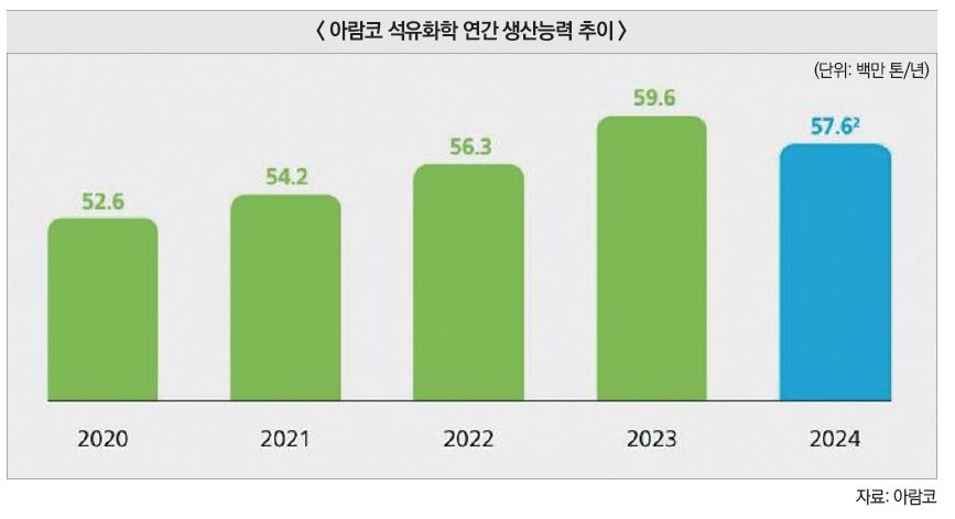 2024년 기준 석유화학 생산능력은 연 5,762만 톤으로, 전년(5,960만 톤) 대비 소폭 감소했다. 이는 아람코 자회사 사빅(SABIC, 2020년 인수)이 유럽 내 생산 시설 3곳을 철수한 데 따른 일시적 요인이다. 다만 2027년 이후 아미랄과 SABIC Fujian Complex(중국 푸젠) 이 본격 가동되면 생산능력은 다시 증가할 것으로 전망된다.