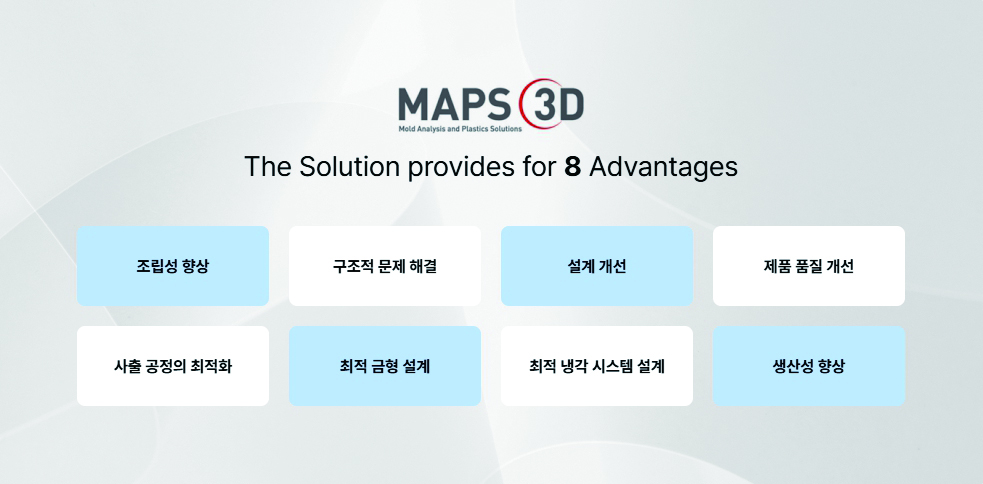 MAPS-3D는 국내 기술로 개발되어 국내 업체 및 사용자 환경에 가장 적합한 사출성형 CAE S/W다.