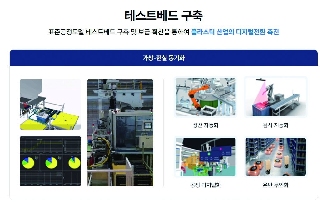 이에 산업통상자원부는 플라스틱 산업의 지속 가능한 자생력 확보와 인력 부족률 해소를 위해, 주관기관인 한국산업기술진흥원과 더불어 한국자동차연구원 경기본부 및 한국플라스틱산업협동조합(한국플라스틱환경시험연구원)이 공동으로 수행하는 “플라스틱 산업의 제조공정 혁신 지원을 위한 디지털전환(DX) 기술지원 사업”을 본격적으로 추진해 나감으로써, 플라스틱 제조기업에 DX 표준공정 모델과 테스트 베드 구축을 통해 보급·확산으로, 플라스틱 제조 산업의 공정혁신을 가속화하고 디지털전환 촉진을 지원하고 있다.