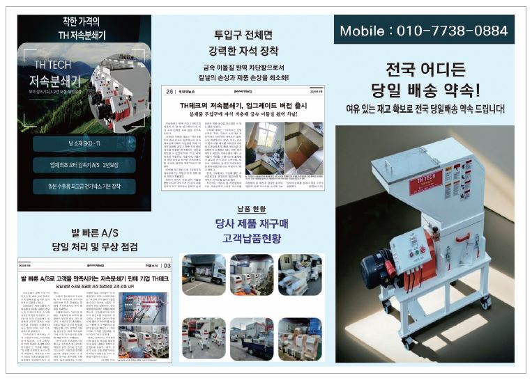티에치테크의 저속분쇄기는 뛰어난 품질과 저렴한 가격을 동시에 갖춰 많은 고객의 선택을 받고 있다. 이태화 대표는 “중국에서 다수의 메이커와 미팅한 결과, 현재 판매하고 있는 제품이 칼날, 전기 박스, 장비 높이 등 모든 사양에서 가격 대비 품질이 가장 우수하여 선택하게 되었다”라며, “실제로 티에치테크가 국내에서 가장 저렴한 저속분쇄기를 판매하고 있다고 자신하고 있다”라고 강조했다.