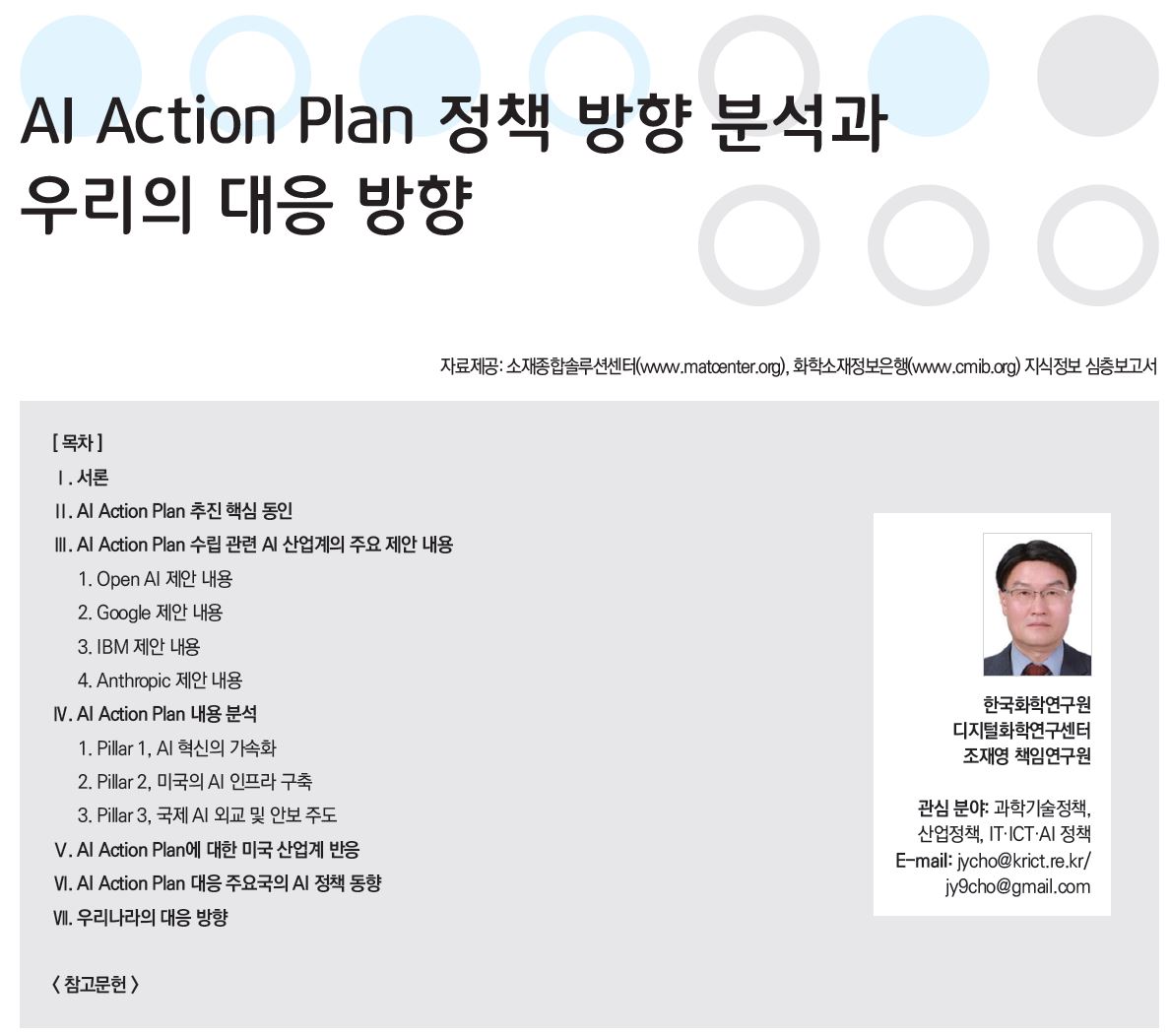 따라서 본 고에서는 빅테크의 정책적 제안이 AI Action Plan에 어떠한 방식으로 반영되어 있는지, AI Action Plan 실행에 대해 어떤 반응을 보이고 있는지를 검토하며, AI Action Plan의 이해 당사자인 글로벌 주요 국가들이 어떤 대응 전략을 마련하고 있는지도 함께 확인한다. 또한 미·중 간 AI 기술 패권 경쟁 구도 속에서 부분적 AI 주권 확보 방안을 모색해야 하는 우리나라 입장에서는 이번 AI Action Plan이 갖는 글로벌 빅테크의 이해관계를 중심으로 위기, 기회, 도전을 면밀히 분석하고 이를 바탕으로 국익에 부합하는 전략적 선택을 해야 할 필요가 있다.