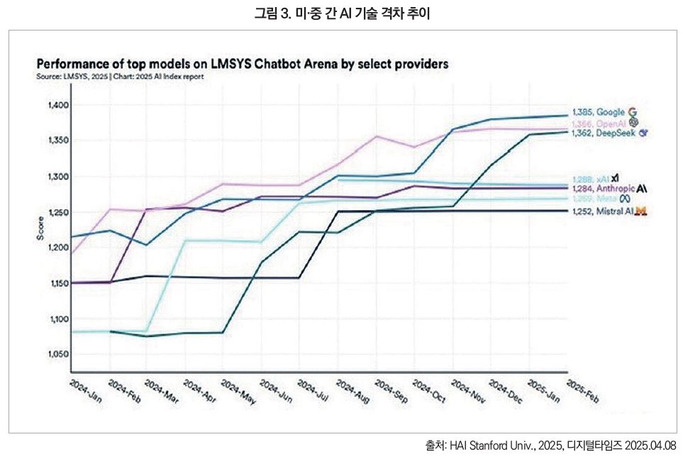 ④ 중국의 AI 분야는 2015년 국가 주도의 인터넷 전략의 일환으로 압도적인 규모의 데이터를 생성하게 되었다. 아울러 미·중 간 무역 마찰로 자립 역량을 강화하게 되면서 마침내 2024년에 ‘DeepSeek’라는 저비용 LLM 모델을 개발하여 세계의 주목을 받게 되었다. 이러한 결과를 바탕으로 미·중 간 기술 격차(그림 3)는 2~3%대 수준으로 크게 좁혀졌으며, 중국의 AI 분야 투자 규모 또한 급격히 증가하여 2023년 대비 국가 투자액(21.1억 달러)은 미국 대비 77% 수준까지 상승하였다.