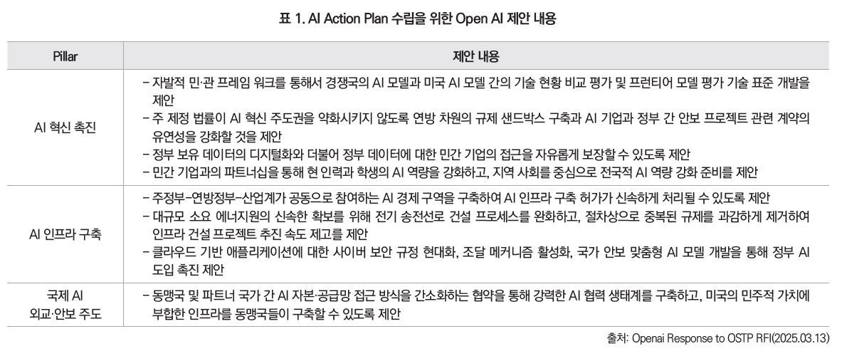 오픈 AI는 먼저 미국이 AI 분야에서 선도적 지위 자리가 약화되는 것을 우려한다고 밝히며, 이를 예방하기 위해 연방정부와 민간 기업 간의 자발적 협력 프레임 워크를 구축할 것과 혁신의 자유 보장, 민주적 AI 수출 통제, AI 인프라 구축, 정부의 AI 선제 도입 등과 관련된 몇 가지 내용을 RFI 답변을 통해 제안하였다(표 1).