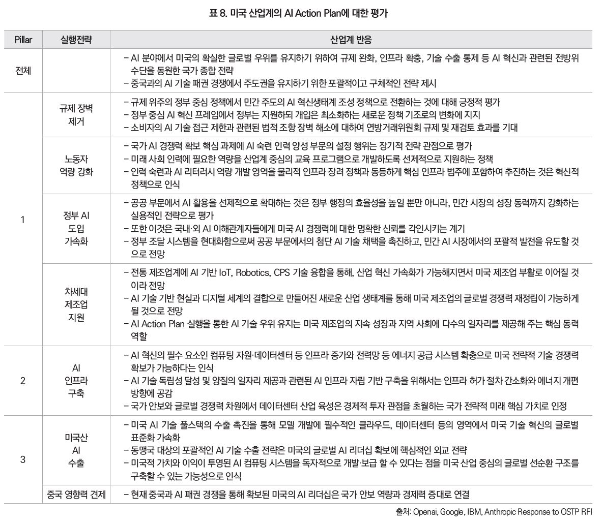 Ⅴ. AI Action Plan에 대한 미국 산업계 반응 중국과의 패권 경쟁 구도 속에서 AI 글로벌 리더십 확보를 위한 국가 역량 강화 차원에서 미국 정부는 AI 산업계의 공개적 요구 사항들의 많은 부분을 수용하면서 AI Action Plan이 계획되었다. 따라서 가장 먼저 우호적 평가(표 8)를 표명한 부문은 계획에서부터 깊게 관여해 왔던 글로벌 빅테크를 포함하는 미국 AI 산업계였다. 미국의 AI 산업계는 줄곧 오픈 AI 기술 개발 및 표준화 생태계와 산업계 중심의 전문 인력 양성 체계 조성, 그리고 국가 차원의 인프라 확장 및 글로벌 수출 환경 구축 지원과 국가 안보 역량 강화 등의 내용을 정부에 주장해 오고 있었다. 마침내 AI Action Plan의 실행으로 AI 개발·공급·활용 기업과 AI 인프라 제공 기업들은 정부의 AI 관련 규제 완화 조치, 인프라 투자 확대와 글로벌 수출 확대 등 다양한 수혜 기회를 얻을 것으로 예상된다. 이에 앞으로 글로벌 빅테크들은 천문학적인 자금력, 기술력 및 인적자원과 미국 정부의 지원을 앞세워 지금보다 더 공격적으로 글로벌 시장을 공략할 것으로 예측되며, 이런 일방적 공격에 대응해야 하는 우리의 전략도 글로벌 빅테크의 움직임에 유연하게 대처할 수 있어야 할 것이다.