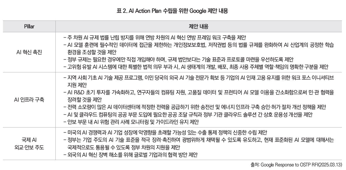 구글은 트럼프 행정부의 AI Action Plan 추진이 현재 미국의 글로벌 AI 지배력을 강화 및 유지하기 위한 시의 적절한 조치임을 강조하였다. 아울러 배타적 글로벌 AI 지배력 확보를 달성하기 위해서는 AI 기술 혁신에 과감한 투자, 정부 영역의 AI 채택 가속화, 친 혁신 접근 방식의 국제적 확산 등 3가지 핵심 영역에 집중할 것을 제안하였다(표 2).