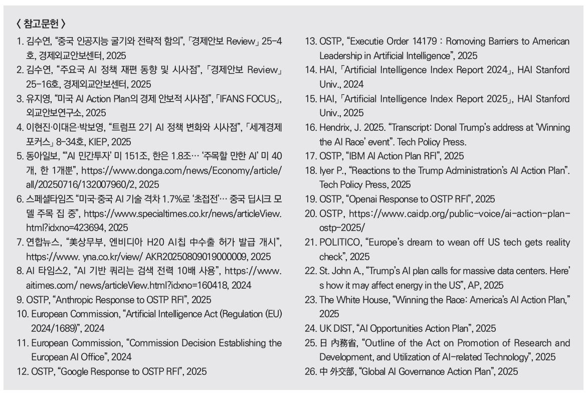 그중 첫 번째는 미·중 간 AI 패권 경쟁에 관한 것으로, 미국은 AI Action Plan을 통해 자국 중심 기술 혁신, 인프라 확충, 그리고 동맹국으로의 기술 수출 블록을 구축하게 되고, 중국은 이에 대응하여 국가가 주도하는 AI 자립과 디지털 실크로드 전략을 추구하게 될 것이다. 이들 두 강대국 간 AI 칩 수출 통제, 희토류 수출 통제, 자국 가치 확산을 위한 글로벌 거버넌스 확장 경쟁 및 AI의 군사 활용 가능성 증대로 기술 패권 대립은 더욱 심화할 것이다. 두 번째는 글로벌 AI 규범 설정 과정에서 미국, 영국 등을 중심으로 하는 산업계 지향적 혁신 규제 완화 조치 전략과 EU, 중국 등 다수 국가의 인권과 윤리 기반 안전한 AI를 위한 규제 법제화 노력 간 충돌 가능성을 간과할 수 없다는 것이다. 마지막으로, 미국 및 중국 등 AI 선도국들의 풀스택 수출에 기인하는 데이터 자원, 오픈소스 및 기술 표준화 문제 등은 국가별 데이터 자원 보호, 기술 자립 한계 및 표준화 주도권 측면에서의 경쟁으로 심각한 후유증을 동반할 수 있다는 것이다.
