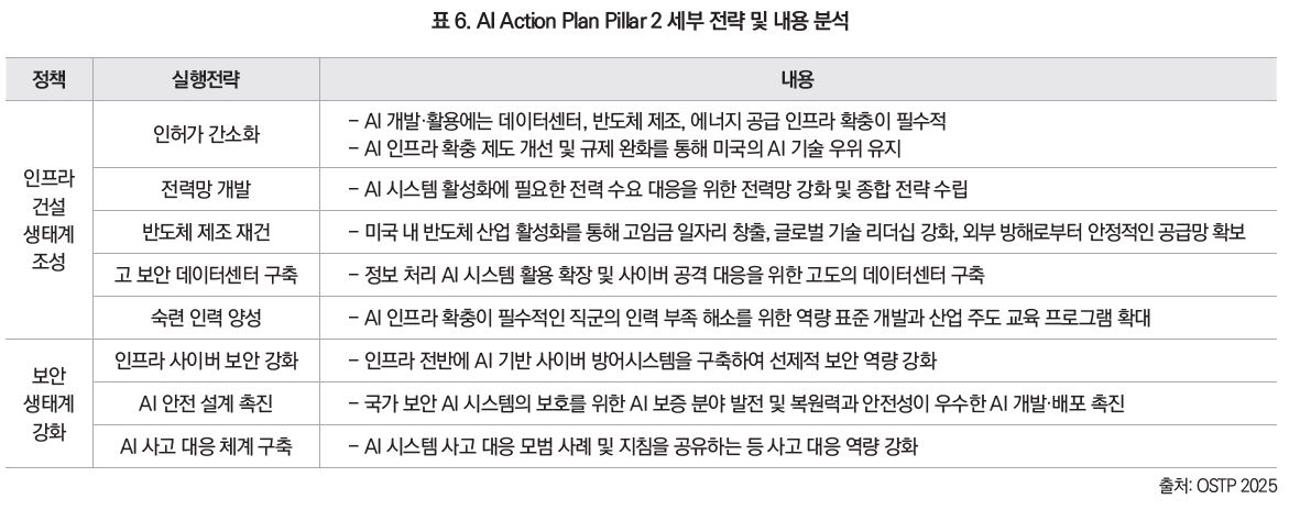 Pillar 2는 2개의 정책 영역과 8개 세부 실행전략(표 6)으로 나누어 볼 수 있으며, 정부는 글로벌 AI 기술 경쟁에서의 우위를 확보하기 위해서는 AI 인프라건설에 대한 생태계 구성의 근간을 전략적으로 확충해야 한다는 것이다. 여기에는 반도체 제조, 고 보안 데이터센터, 고효율 전력망, 숙련된 전문 인력, 사이버 보안 역량, AI 사고 대응 체계 등이 있으며, 이것들은 곧 AI 인프라 구성의 핵심을 이룬다.