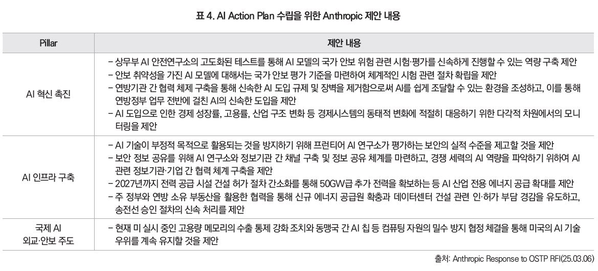 Anthropic은 미국이 가지고 있는 AI 기술적 우위를 계속 유지하기 위해서는 국가 안보 역량과 보안 수준을 강화하고 특정 AI 모델에 대한 수출 통제를 강화해야 한다고 제안했다. 또한 AI 기술력을 더욱 강화하기 위해서는 AI 산업 전용 전력을 추가적으로 확보하여야 하고, 정부 차원의 AI 조달 환경을 적극 조성하며, AI가 유발하는 경제 지표의 변화 모니터링과 그 변화에 대응하는 방안을 마련하는 것이 AI Action Plan에 적극적으로 반영되어야 한다고 RFI 회신에서 밝혔다(표 4).
