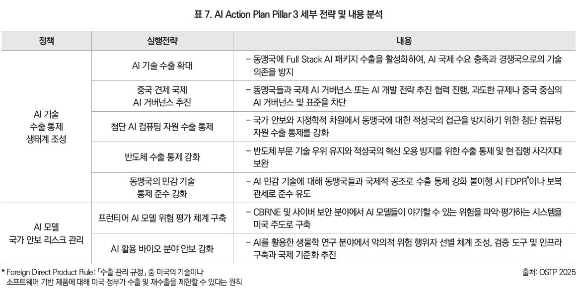 Pillar 3는 2개의 정책 영역과 7개 세부 실행전략(표 7)으로 나누어 볼 수 있으며, 미국이 글로벌 AI 경쟁에서 승리하기 위해서는 자국 내에서 AI 혁신과 인프라를 장려하는 노력 이상으로 동맹국들에도 관심을 가져야 한다는 것이다. 여기에는 미국산 AI 기술 및 제품 수출 촉진, 규범 정합성을 통한 공급망 및 AI 시스템 공동 보안 조치 강구, 그리고 경쟁국에는 전략적 통제로 외교·안보 주도권을 유지해야 한다는 내용을 담고 있다.