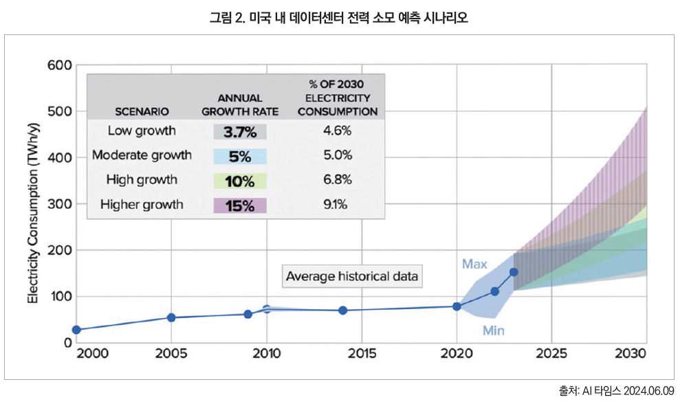 ③ AI 기술 혁신을 위한 대규모의 AI 컴퓨팅 자원의 활용은 막대한 용량의 데이터 처리를 위한 GPU, NPU 및 HBM의 과도한 사용으로 인해 전력 수요가 기하급수적으로 증가할 것으로 예측(그림 2)된다. 따라서 AI 산업계는 기술 혁신 속도에 병행할 수 있는 전력 공급을 요구하고 있으며, 정부는 산업계의 요구를 담보할 수 있는 전력 공급 인프라 확충과 이를 위한 규제 완화 정책이 있어야 하게 되었다.