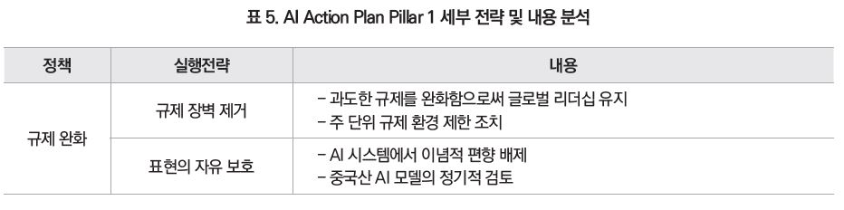 Pillar 1은 5개 정책 영역과 15개 세부 실행전략(표 5)으로 나누어 볼 수 있으며, 정부는 AI 기술 개발을 저해하는 규정, 지침, 행정명령의 규제 장벽을 과감히 제거해야 한다는 것이다. 또한 민간이 연구개발을 주도할 수 있도록 유도하고, AI 기술 발전이 전 산업계로 확산할 수 있도록 지원함으로써 미국의 AI 기술 혁신 역량을 전방위적으로 강화할 수 있는 전략을 실행에 옮겨야 한다는 것이다.