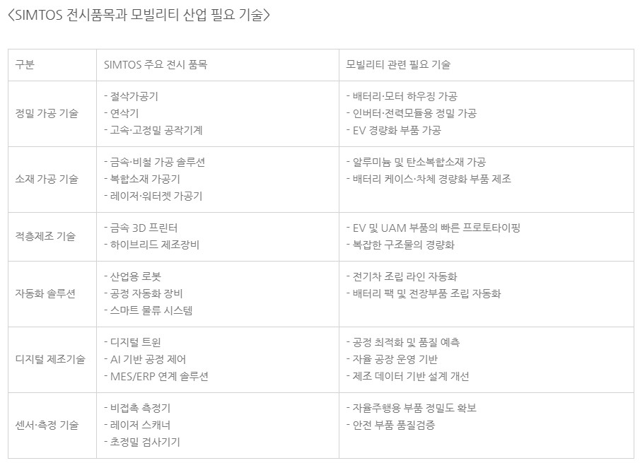2024년에 열린 SIMTOS 2024에서는 절삭가공 및 3D 프린팅을 활용한 EV 부품 제조기술, 배터리 케이스 가공 기술, 초경량 소재, 전기차 및 UAM용 경량화 소재(알루미늄·탄소 복합소재 등)가 전시되었다. 특히 2전시장에 마련된 로봇 및 디지털제조기술 특별전(M.A.D.E. in SIMTOS)에서는 디지털트윈, 자동화 로봇 등 AI 기반 제조기술과 함께 LiDAR, 레이더, 카메라 등 자율주행 센서용 초정밀 부품 가공 시연도 함께 진행되었다.