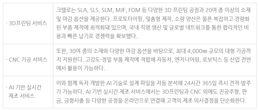 2021년 설립된 ㈜크렐로는 AI 기반 온라인 제조 서비스를 통해 글로벌 제조업 혁신을 선도하고 있는 기업이다. 3D프린팅, CNC 가공, 판금, 진공주형, 금형 사출 등 다양한 공정을 지원하며, 자체 개발한 AI 기술로 고객의 설계 파일을 자동 분석해 실시간 견적과 납기 정보를 1분 내에 제공하는 것이 특징이다.