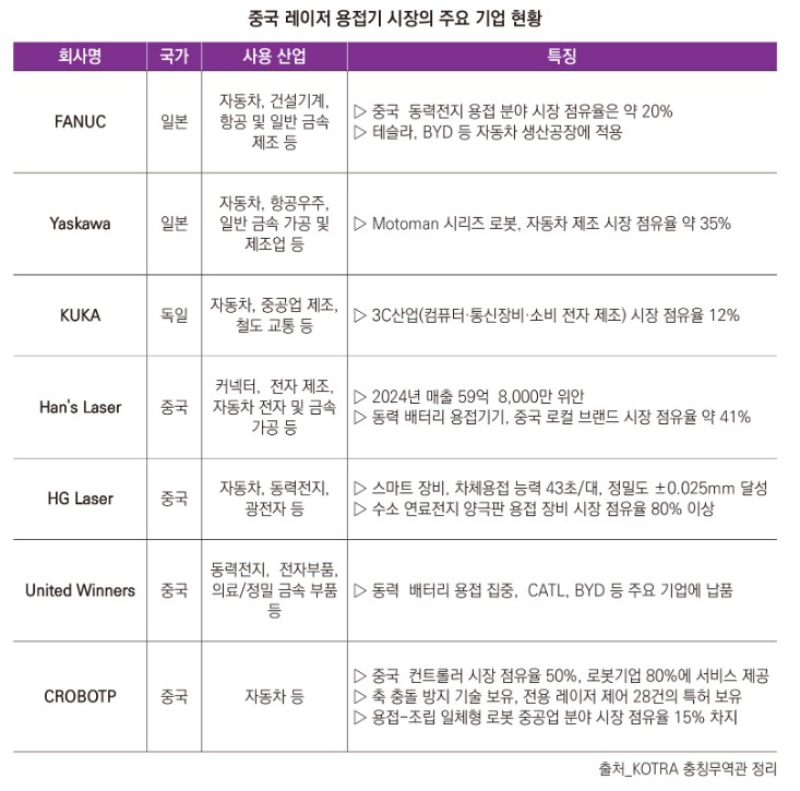 현재 중국 레이저 용접 장비 시장에서 해외 기업들의 점유율은 약 80%에 육박하며 절대적인 영향력을 행사하고 있다. 특히 화낙(FANUC), 야스카와(Yaskawa), 쿠카(KUKA) 등 글로벌 로봇 및 자동화 기업들이 선두 그룹을 형성하고 있다.