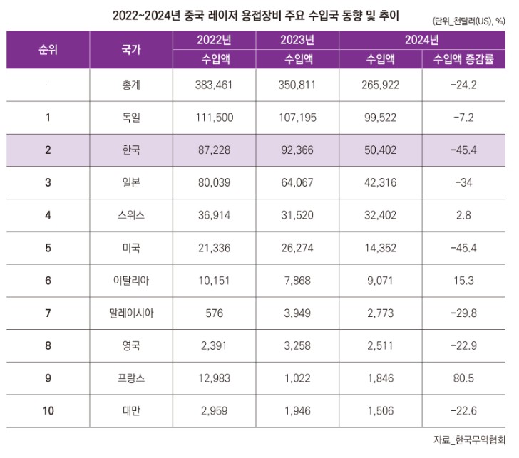 중국이 주로 장비를 수입하는 국가는 독일, 한국, 일본, 스위스, 미국 등 기술 선진국들이다. 이 중 한국산 레이저 용접기에 대한 수요 변화가 가파르다. 대중국 한국산 레이저 용접기 수입액은 2021년 1억 1,400만달러로 최고치를 기록했으나, 이후 하락세를 면치 못하고 있다.