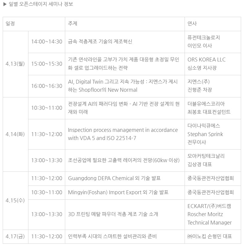 오픈스테이지 세미나는 단순한 제품 소개를 넘어, 참가업체가 보유한 핵심 기술과 실제 산업 적용 사례를 공유하는 ‘현장형 기술 세미나’로 구성된다. 금속 적층제조, 초정밀 가공 자동화, AI 및 디지털트윈 기반 스마트 제조, 고출력 레이저 가공 등 제조 산업 전반을 아우르는 다양한 주제가 다뤄진다.