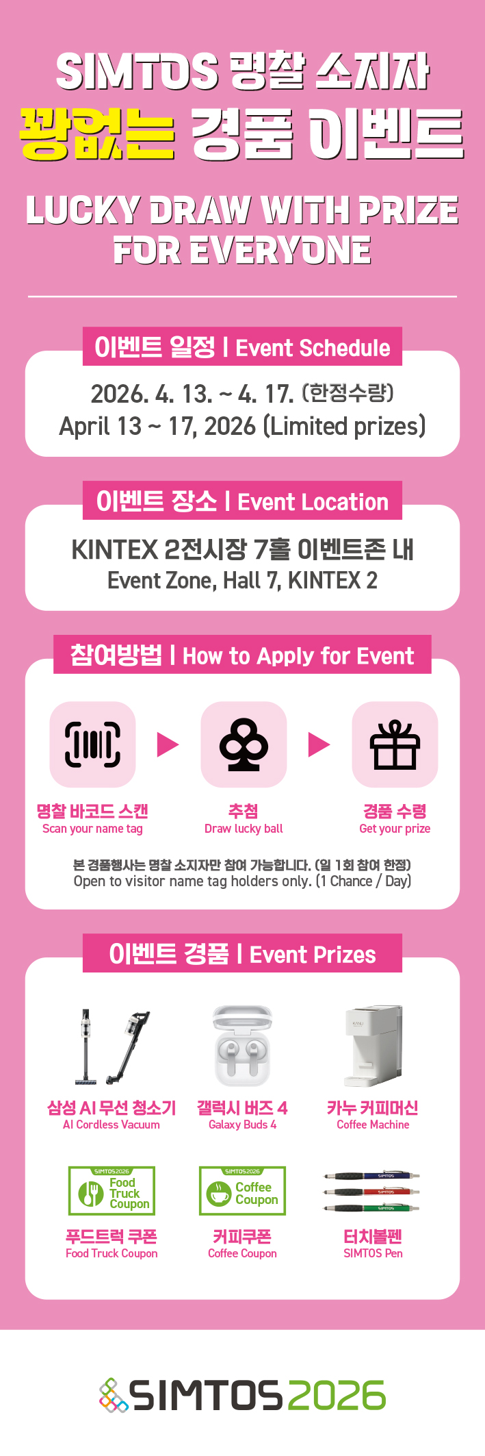 제2전시장 7홀에 마련된 Lucky Draw Zone에서는 SIMTOS의 묵직한 산업 콘텐츠 속에서 잠시 숨을 고를 수 있는 ‘리프레시 이벤트’가 진행된다. SIMTOS 2026 참관객뿐만 아니라 참가업체 전시 담당자도 참여할 수 있다. 꽝이 없는 경품 이벤트로 ‘가챠 방식’으로 운영돼 참여 자체만으로도 즐거움을 제공한다. 경품 역시 ▷삼성전자 AI 무선청소기 ▷갤럭시 버즈 4 ▷카누 커피머신 ▷푸드트럭·커피 쿠폰 등 실생활과 연결된 아이템으로 구성되어 있다.