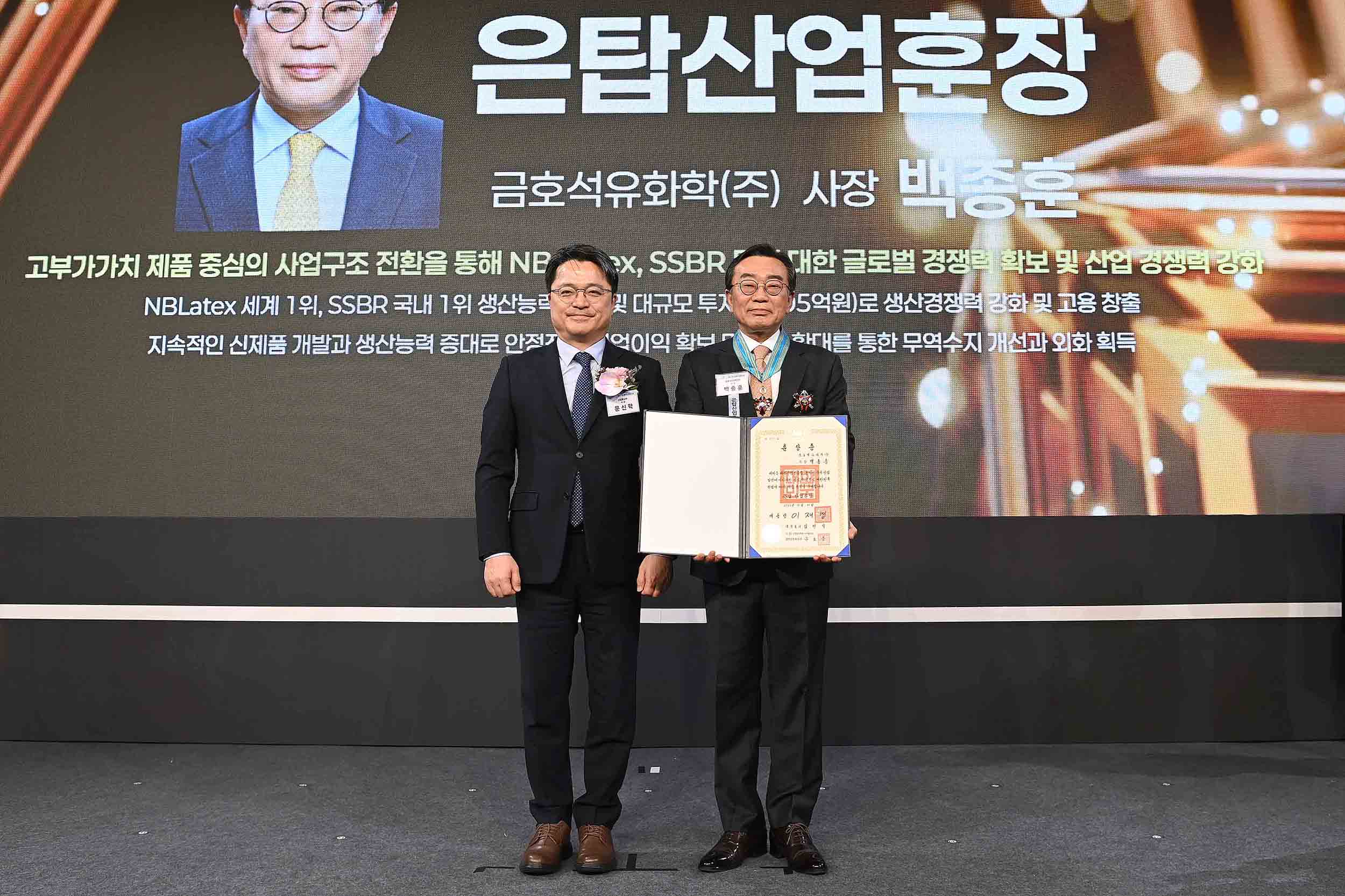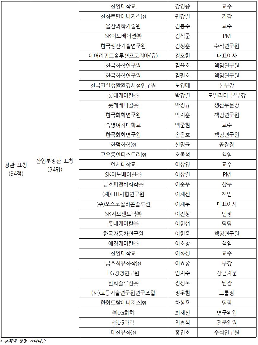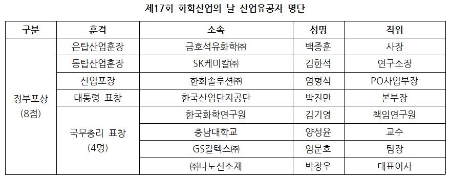 한편 이날 기념식 행사에서는 화학산업의 발전과 국가 경제에 이바지한 공로로 백종훈 금호석유화학 사장이 은탑산업훈장을, 김한석 SK케미칼 연구소장이 동탑산업훈장을 받는 등 유공자 총 42명이 훈장·표창 등을 수상했다.