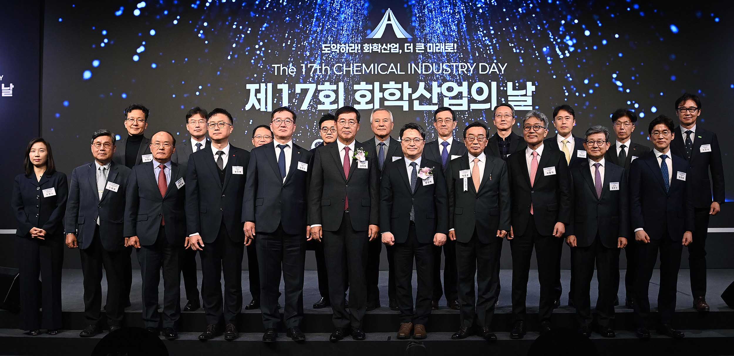 「제17회 화학산업의 날」 기념행사에서 주요 참석자들이 기념촬영을 하고 있다.