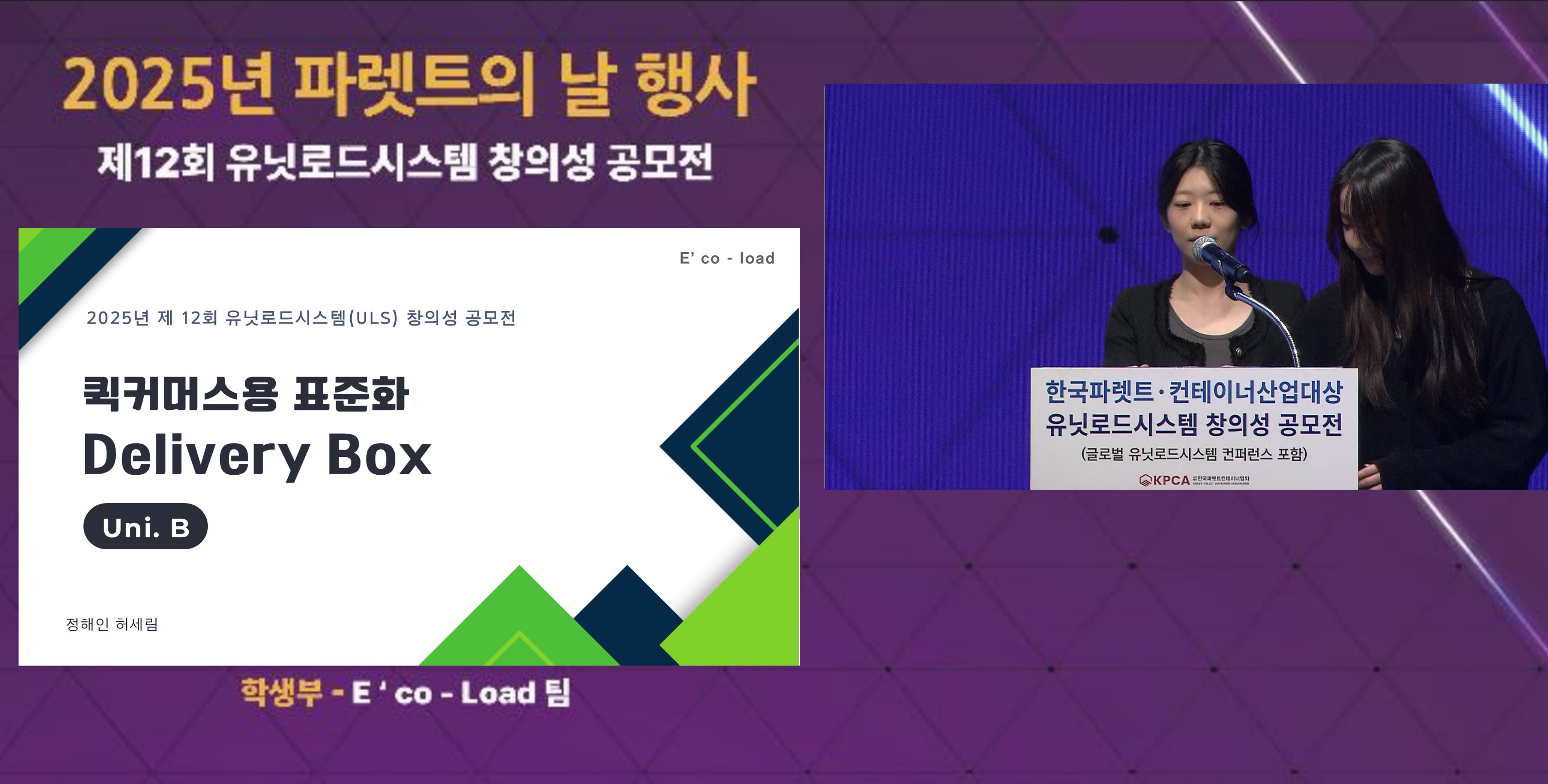 유닛로드시스템 창의성 공모전 수상 내역으로는 일반부 대상에 △ EGG LPAI(라파이): 계란 유닛로드, ESG·자동화 콜드체인 기반 혁신 플랫폼을 발표한 EGG LAPI와 홈플러스팀, 그리고 우수상에 △소형 군수품 전용 다회용 운송상자 도입을 발표한 화기애애팀과 PLCM: Pallet Life Cycle Mgmt(파렛트 생애 주기 관리 시스템 + 스마트 ULS)를 발표한 LSRC: LOTTE SCM Research Club팀, 장려상에는 △ 군수부대 기동화를 위한 컨테이너 물류체계 구축을 발표한 터미네이터팀과 원통형 유리섬유 제품 기존 일회용 목재박스 포장을 리터너블 철재 물류기기에 적용을 발표한 모든 원통 – 철재 담아팀, 창의상에는 △ 다단 적재용 철재 물류기기 높이조절을 통한 효율 향상을 발표한 AUTO팀, 파렛트 적재품 – 일회용 랩, 그물망, 골판지 상자를 대체하는 반복 사용 단프라 물류기기 개발을 발표한 두르고 담아팀, GPT와 RPA를 활용한 물류 서류 관리 Digital Transformation을 발표한 동원로엑스팀, 원료 이송기를 발표한 한국파렛트풀 케미칼팀, 전력 인프라 없이 자가발전이 가능한 태양광 충전 친환경 물류 대차를 발표한 SUN_LOGIS(썬로지스)팀, 디지털 트윈 기반 AR 파렛트 관리 시스템을 발표한 은성트래시스㈜팀, 수작업 상·하역을 위한 물류 장비를 발표한 흐름(Flow)팀이 수상의 영예를 안았다.