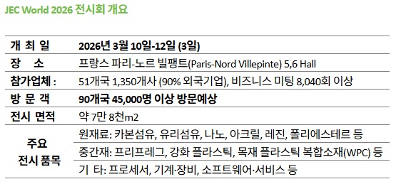 세계 최대 규모의 복합소재 전시회 JEC WORLD 2026이 오는 2026년 3월 10일부터 12일까지 프랑스 파리 노르 빌팽트(Paris-Nord Villepinte) 전시장에서 개최된다. 전 세계 복합소재산업을 대표하는 국제 전시회로 자리매김한 JEC WORLD는 매년 산업 혁신, 비즈니스 네트워킹, 글로벌 협업의 중심 무대로 역할을 강화하고 있다.