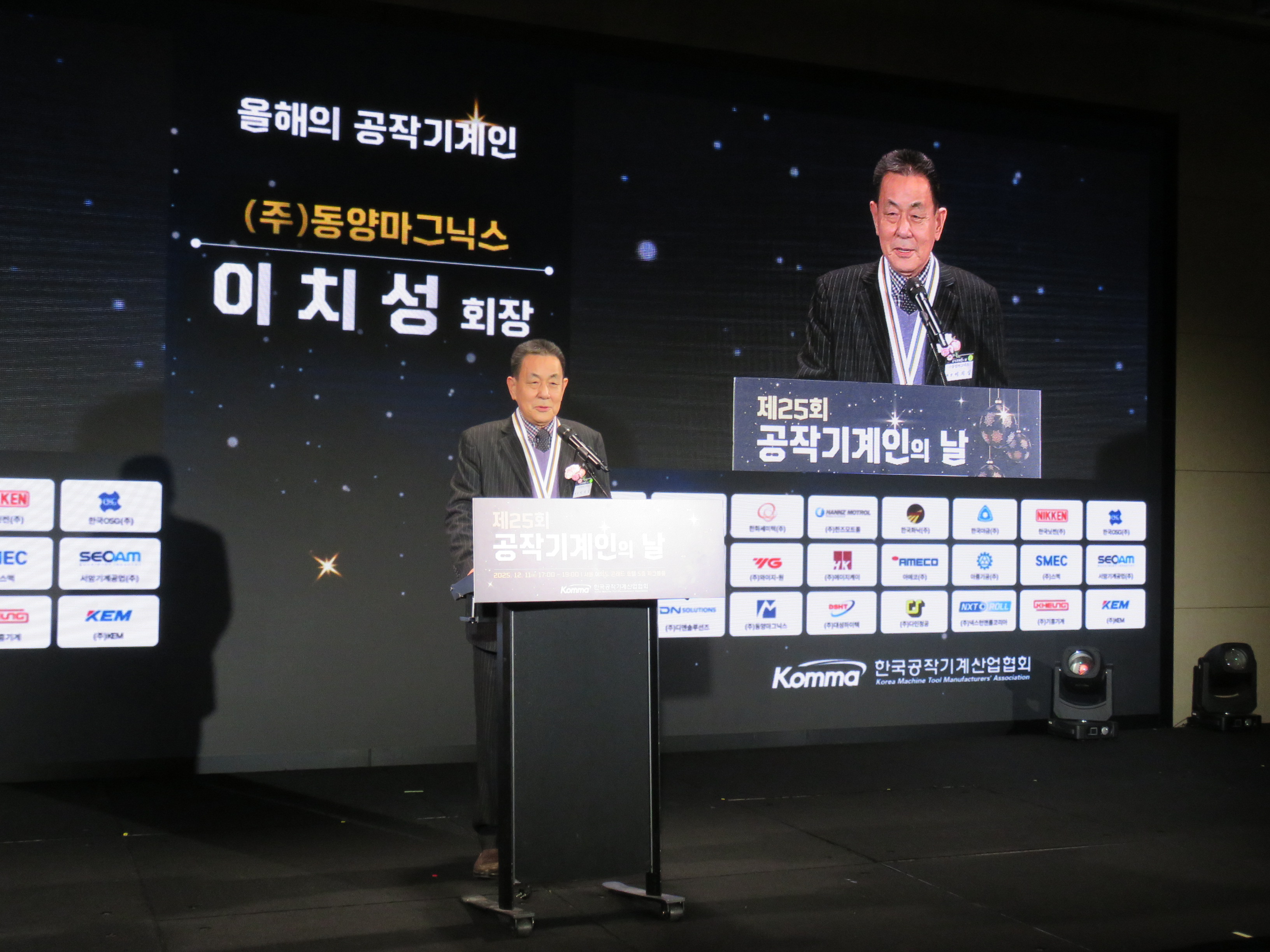 가장 큰 영예인 ‘올해의 공작기계인’에는 48년간 고품질 가공 솔루션을 제공하며 국내 공작기계 산업 발전에 기여해 온 공로를 인정받아 ㈜동양마그닉스 이치성 회장이 선정됐다. 이치성 회장은 1977년 동양마그닉스의 전신인 ‘동양방전’을 설립한 이후 CNC 방전기 국산화를 시작으로 국내 공작기계 기술 자립에 앞장서 왔다. 특히 소형 머시닝센터 분야에서 기술 경쟁력을 확보하며 국내 시장을 선도해 온 공로가 높이 평가됐다.