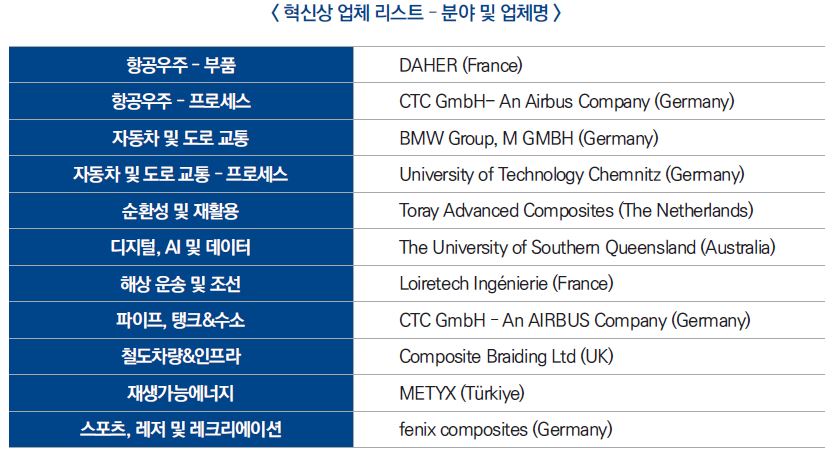본 혁신상는 검증된 콘셉트 또는 협업 기반 혁신을 보유한 기업, 대학, 연구개발(R&D) 기관을 대상으로 한다. 또한 최신 트렌드에 관심을 가진 글로벌 전문 방문객에게 복합 소재의 최신 트렌드를 선보이는 글로벌 플랫폼으로 자리매김했다.