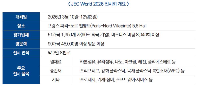 세계 최대 규모의 복합소재 전시회 JEC WORLD 2026이 오는 2026년 3월 10일부터 12일까지 프랑스 파리 노르 빌팽트(Paris-Nord Villepinte) 전시장에서 개최된다. 전 세계 복합소재 산업을 대표하는 국제 전시회로 자리매김한 JEC WORLD는 매년 산업 혁신, 비즈니스 네트워킹, 글로벌 협업의 중심 무대로 역할을 강화하고 있다.