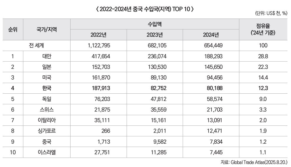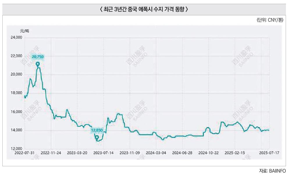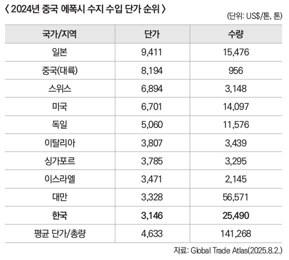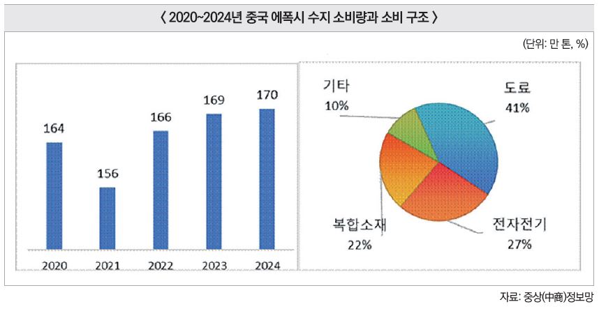 2024년 중국의 에폭시 수지 수입국(지역) 중 대만이 28.8%로 1위를 차지했다. 일본(22.3%)과 미국(14.4%)이 뒤를 이었고, 한국에서는 에폭시 수지를 8019만 달러 수입해 12.3%의 비율로 4위를 차지했다.