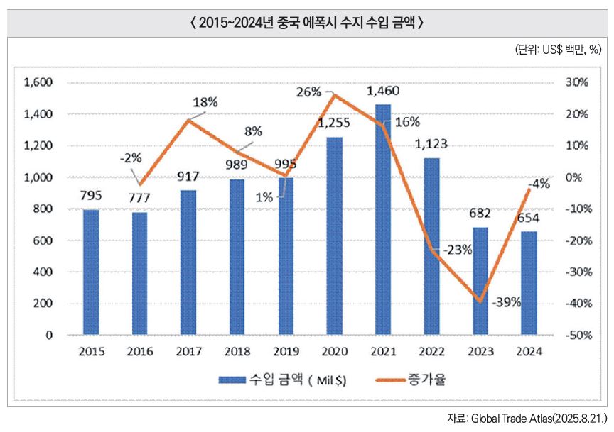 2021년 이전에는 중국의 에폭시 수지 수입 규모가 지속적으로 증가해 수입액이 2021년에 정점(14억 6,000만 달러)에 달했다. 2021년 이후, 수입 규모가 감소해 2024년 중국의 에폭시 수지 수입은 6억 5,400만 달러로 2023년에 비해 4% 감소했다.