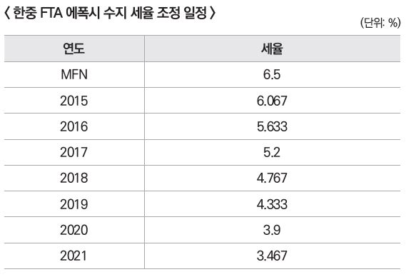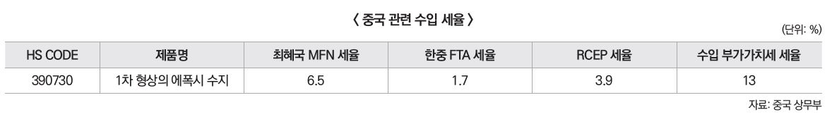 한국의 에폭시 수지 제품은 중국으로 수출할 때 한중 FTA를 통해 1.7%의 세율을 적용받고 있으며, 이는 RCEP 세율(3.9%)보다 더 유리하다. 수출품에 한중 FTA 협정 세율을 적용하려면 한국 관세청이나 대한상공회의소로부터 원산지 증명서를 발급받아야 한다.