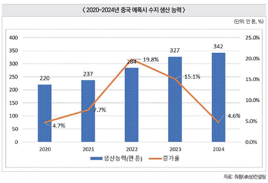 2020~2021년, 업계의 수익이 높아지자 많은 신규 프로젝트가 건설됐고, 이로 인해 중국의 에폭시 수지 생산 능력이 빠르게 증가했다. 2024년에는 과잉 생산으로 인한 수익성 하락으로 생산 능력 증가 속도가 다소 둔화했다. 2024년 중국의 에폭시 수지 총생산 능력은 342만 톤으로 2023년에 비해 .6% 증가했다.