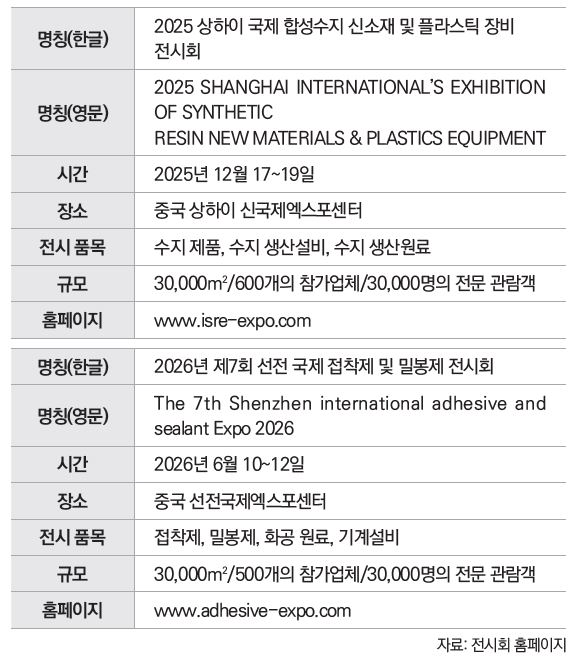 중국 시장에 범용급 중국산 에폭시 수지 제품이 집중돼 있지만, 고급 제조산업은 여전히 수입 에폭시 수지를 사용하고 있다. 따라서 한국 기업은 산업 전시회를 통해 중국 에폭시 수지 시장의 발전 동향을 파악할 수 있으며, 중국 고객과 직접 소통해 즉각적인 주문을 얻거나 장기적인 협력 의향을 촉진할 수 있다. 다음은 2025년 하반기와 2026년 상반기에 열리는 중국 내 유망한 에폭시 수지 전시회 정보다.