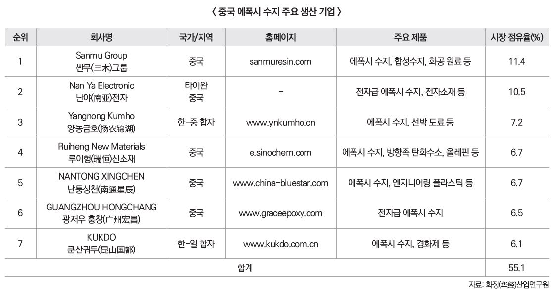 현재 중국의 에폭시 수지 산업 CR7(TOP 7 생산 기업의 생산 능력 비율 합계)은 55.1%다. 그중 1위 기업은 싼무(三木)그룹으로, 생산 능력 비중이 11.4%다. 그다음으로 타이완의 난야전자(10.5%), 한-중 합작법인 양농금호(7.2%) 순이다.