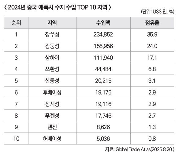 중국의 에폭시 수지 수입 지역을 보면, 주로 전자 산업이 비교적 발달한 몇몇 연해 지역에 집중돼 있다. 장쑤성(35.9%), 광둥성(24.0%), 상하이시(17.1%)가 총 77%를 차지하고 있다.