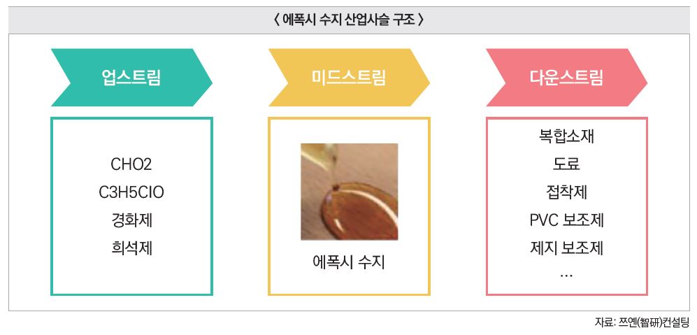 에폭시 수지(Epoxy Resin)는 기계적 특성, 절연성, 내부식성 및 접착성이 우수한 열경화성 수지다. 에폭시 수지 산업의 업스트림에는 주로 비스페놀 A(CHO2), 에피클로로히드린(C3H5ClO) 등 화학 원료가 포함되며, 다운스트림에는 복합 재료, 코팅, 접착제, PVC 보조제, 제지 보조제 등 여러 응용 분야가 있다.