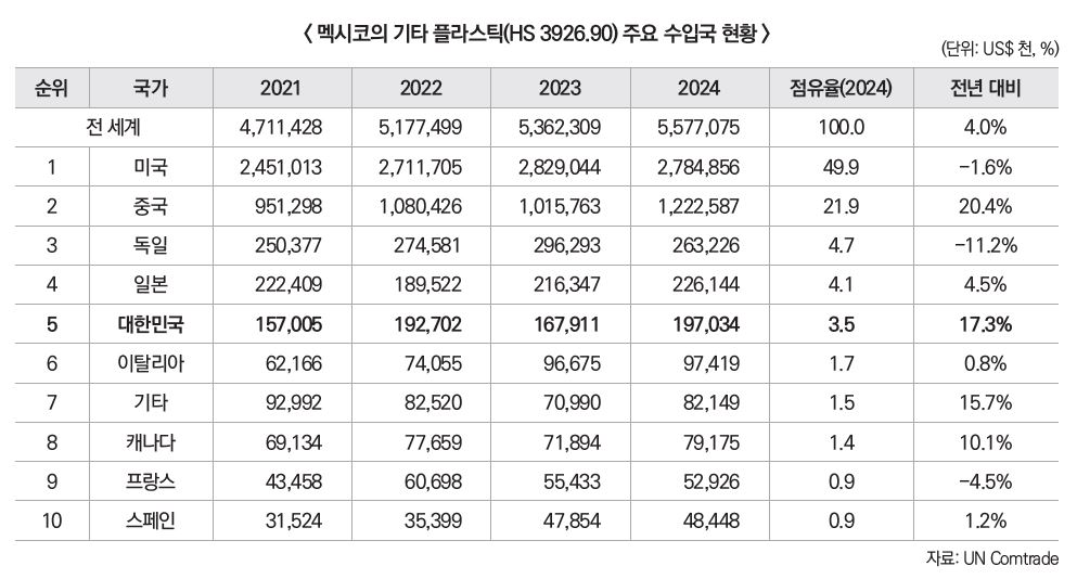 멕시코 경제부에 따르면, 2024년도 전체 플라스틱(HS39) 수입액은 약 320억 달러에 달했으며, 이 중 기타 플라스틱(HS 3926.90) 제품 수입액은 56억 달러이다. 2024년 기준 미국은 멕시코 플라스틱 수입액 비중 중 49.9%를 차지하며 1위를 차지하고 있고, 전년 대비 1.6% 감소했다. 중국은 21.9%로 2위를 차지했으며 전년 대비 수입액이 20.4% 증가했다. 중국산 플라스틱 수입 비중이 늘고 있는 가운데 독일(4.7%)과 일본(4.1%)이 각각 3위, 4위를 차지하고 있다. 대한민국은 멕시코의 제5위 플라스틱 수입국으로 2024년 기준 약 1억 9,700만 불의 수입액을 기록하며 전년 대비 수입액이 17.3% 상승했다.