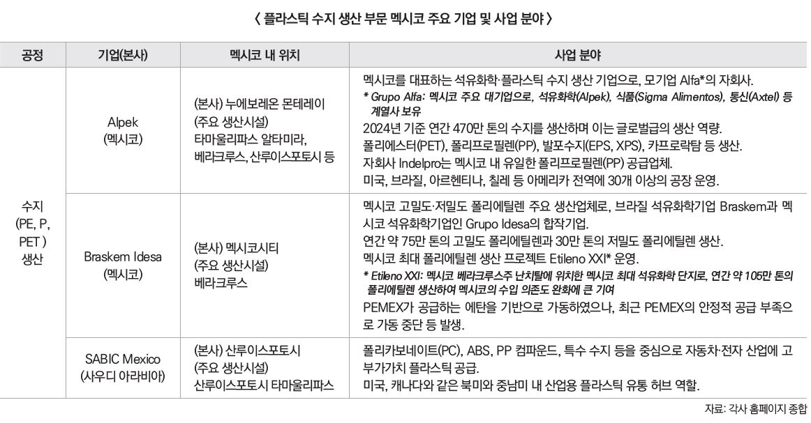 멕시코의 플라스틱 유통구조는 수지 수입 및 현지 생산, 가공 및 제조, 도매 및 물류 등 다층적 네트워크로 이뤄져 있다. 자동차 등 특정 산업별 수출 거점과 면밀히 연결돼 있다는 것이다. 멕시코 내 수지 생산업체는 Alpek, Braskem-Idesa, SABIC 등이 있으나, 에탄과 같은 원료나 산업용수 부족 문제가 불거지는 경우도 종종 존재한다.