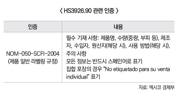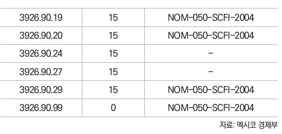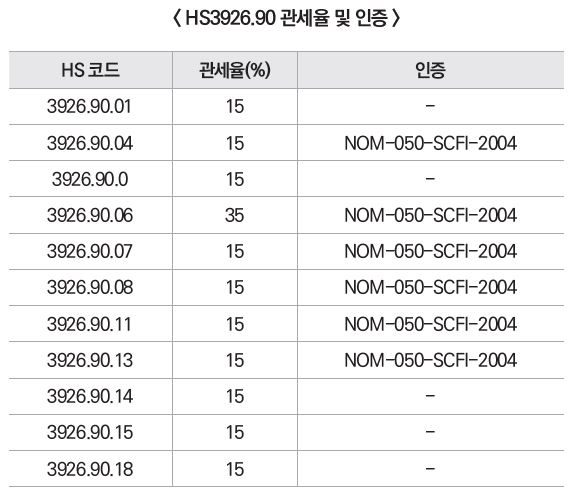 기타 플라스틱 부품(HS3926.90)과 관련한 멕시코의 일반 수입 관세율 및 인증은 아래와 같다.