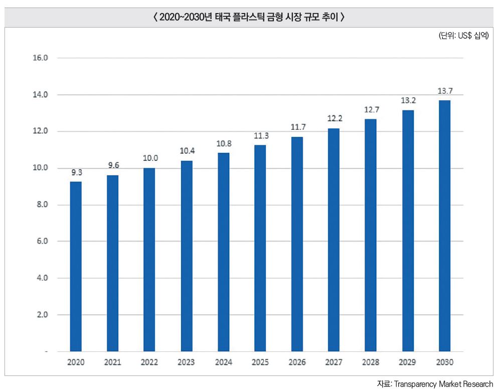 조사기관 Transparency Market Research(TMR)에 따르면, 태국 플라스틱 금형 시장은 자동차, 전자, 포장, 헬스케어, 소비재 등 다양한 산업에서 활용되며, 복잡하고 정밀한 부품을 대량 생산할 수 있는 기술력 덕분에 제조업 전반에서 핵심적인 위치를 차지하고 있다. 이러한 산업 수요에 힘입어 태국의 플라스틱 금형 시장은 2024년 약 108억 달러 규모에 이르렀으며, 2020년부터 2030년까지 연평균 약 4%의 성장률을 기록해 2030년에는 약 137억 달러 규모에 도달할 것으로 전망된다. 특히 태국은 제조업 인프라, 숙련된 노동력, 정부의 산업 지원 정책 등이 잘 갖춰져 있어 글로벌 플라스틱 금형 생산기지로 주목받고 있다.