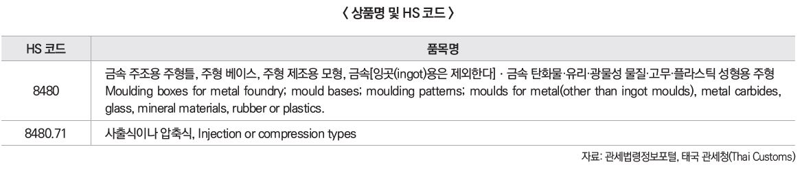 HS Code 8480은 ‘금속 주조용 주형틀 및 성형용 주형’으로 분류되며, 금속이나 기타 재료(금속 탄화물, 유리, 광물성 물질, 고무, 플라스틱 등)의 성형 또는 주조에 사용되는 다양한 주형(Moulds), 주형 베이스(Base), 주형 패턴(Patterns) 등을 포함한다. 단, 금속 잉곳(ingot)용 주형은 제외된다. 특히 하위 분류인 8480.71은 사출식 또는 압축식(Injection or compression types) 성형용 주형으로, 플라스틱 사출 금형 등에 해당한다. HS Code 8480.71은 금형 및 사출기 부품 시장 분석 시 핵심적인 품목으로 활용되며, 자동차, 전자, 플라스틱 제조업 등 다양한 산업군에서 수요가 존재하는 고부가가치 공정재다. 태국 내에서는 제조업 클러스터(특히 EEC 지역)를 중심으로 관련 수입·수요가 꾸준히 이어지고 있다.