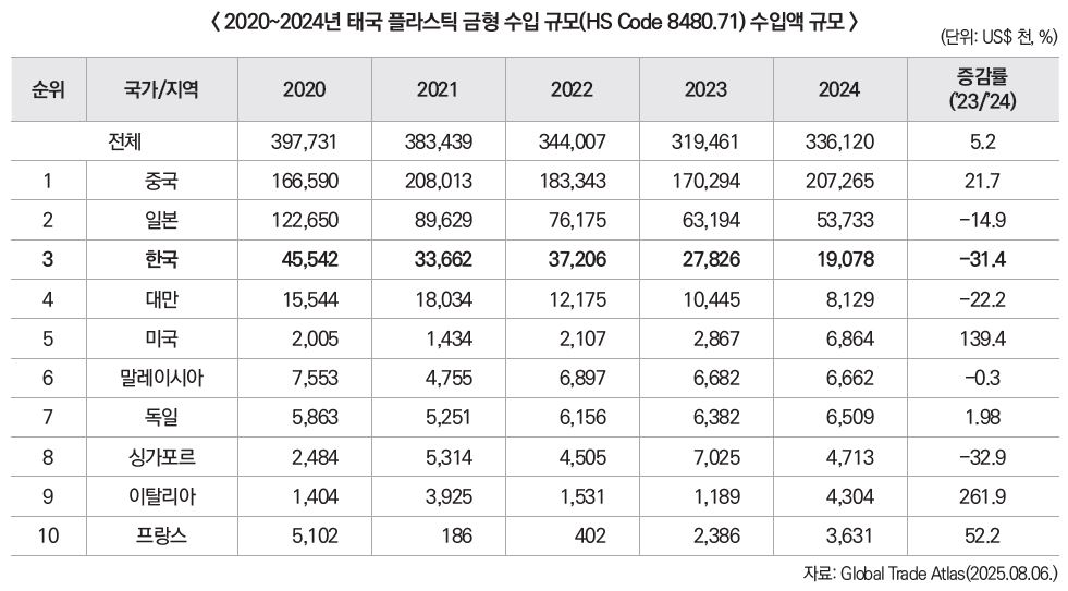 태국 플라스틱 금형 시장은 자동차, 전자, 소비재 등 제조업 전반의 회복과 함께 안정적인 성장세를 이어가고 있으며, 특히 정밀성과 대량 생산이 요구되는 사출 금형 수요가 금형산업 확대를 견인하고 있다. 중국이 여전히 태국의 최대 수입국으로 자리 잡고 있는 가운데, 한국은 상위권 수출국으로 유지되고 있지만, 2024년 기준 수출 규모가 전년 대비 31.4% 감소하는 등 시장 점유율 하락이 뚜렷하다. 이는 가격 경쟁력, 납기, 기술 지원 측면에서 중국 및 미국·유럽계 기업과의 경쟁 심화에 따른 결과로 분석된다.