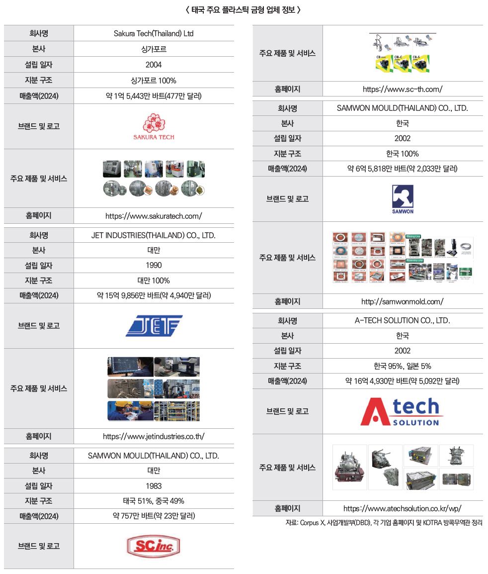 한편, 태국에는 한국계 금형 전문 기업도 진출해 있다. 주로 삼성·LG 등 대기업의 1차·2차 벤더 네트워크를 통해 자동차·전자 부품 사출에 필요한 금형 수요에 대응하고 있다. 이처럼 대기업 벤더 구조에 따라 금형 수입과 제작 수요가 꾸준히 발생하며, 특히 신제품 전환주기에 맞춘 금형 교체·신규 제작이 시장 수요를 뒷받침하고 있다.