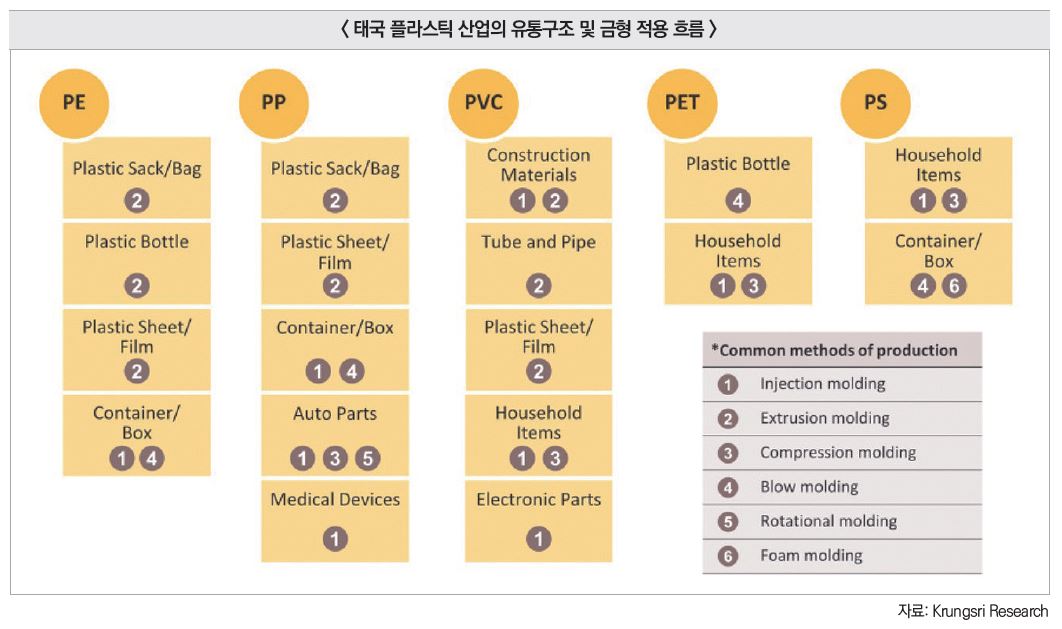플라스틱 금형은 보통 중간재 생산 단계에서 사용되며, 최종 제품 제조를 위한 부품을 대량으로 성형하는 데 사용된다. 이에 따라 금형 자체는 최종소비자가 아닌 사출 금형 공장 또는 OEM 제조업체를 중심으로 유통되며, 주로 태국 내 산업단지에 있는 부품 가공업체나 조립공장을 통해 활용된다. 금형 제작은 일반적으로, 맞춤형으로 이뤄지며, 초기 금형 공급 이후에는 정기적인 유지·보수 또는 교체 수요가 동반돼 관련 서비스 산업도 함께 형성돼 있다. 아래 표는 플라스틱 원재료별 주요 용도와 적용되는 성형 방식, 금형 사용 여부를 요약한 것으로, 산업별 수요 흐름과 유통구조 이해에 참고가 된다.